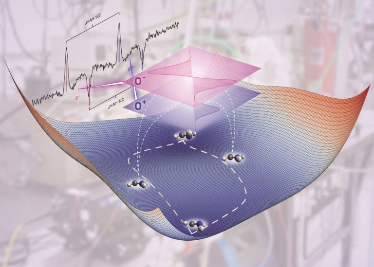 En étroite collaboration avec ses collègues des laboratoires ISMO (Paris-Saclay) et PhLAM (Univ. Lille), les chercheurs ont enregistré avec succès les preuves spectroscopiques du mouvement d’inversion par effet tunnel de grande amplitude, qui est un phénomène purement quantique. Le mouvement par effet tunnel crée des dédoublements de raies caractéristiques dont l’espacement indique la barrière d’inversion entre les deux structures d’équilibre.